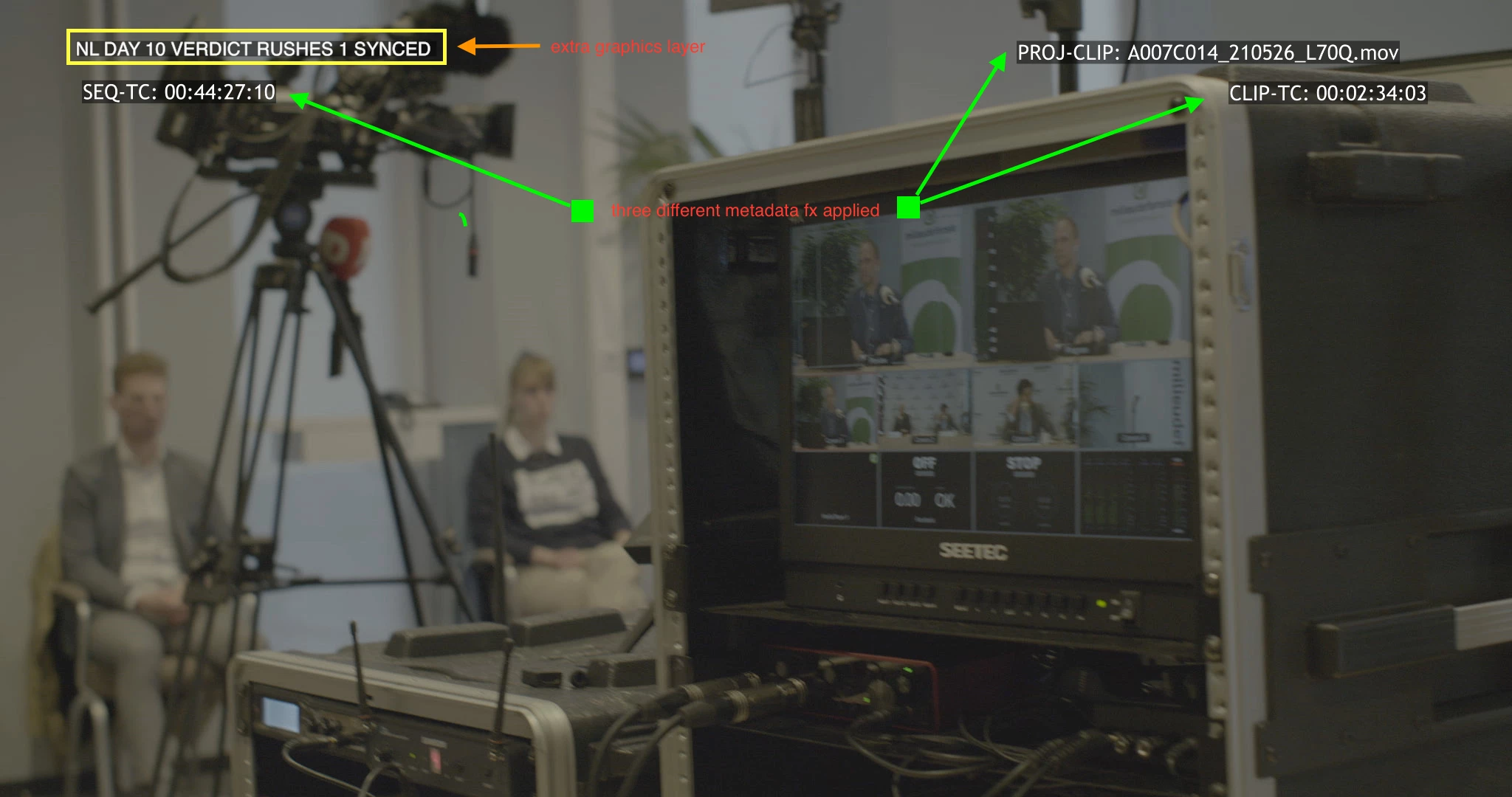 Also it would be verz handy to burn-in the sequenze name as well? The Effect  in the mediaencoder would also make perfectly sense for Dailies timelines, where you put the Metadata FX on in the FX Tab of Media Encoder, and don't have to set up timelines with the effect put into an extra adjustmentlayer?