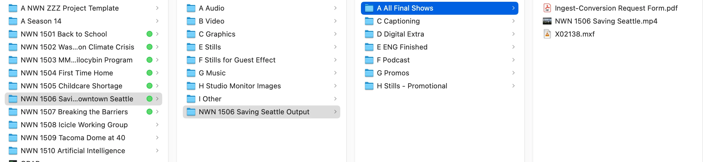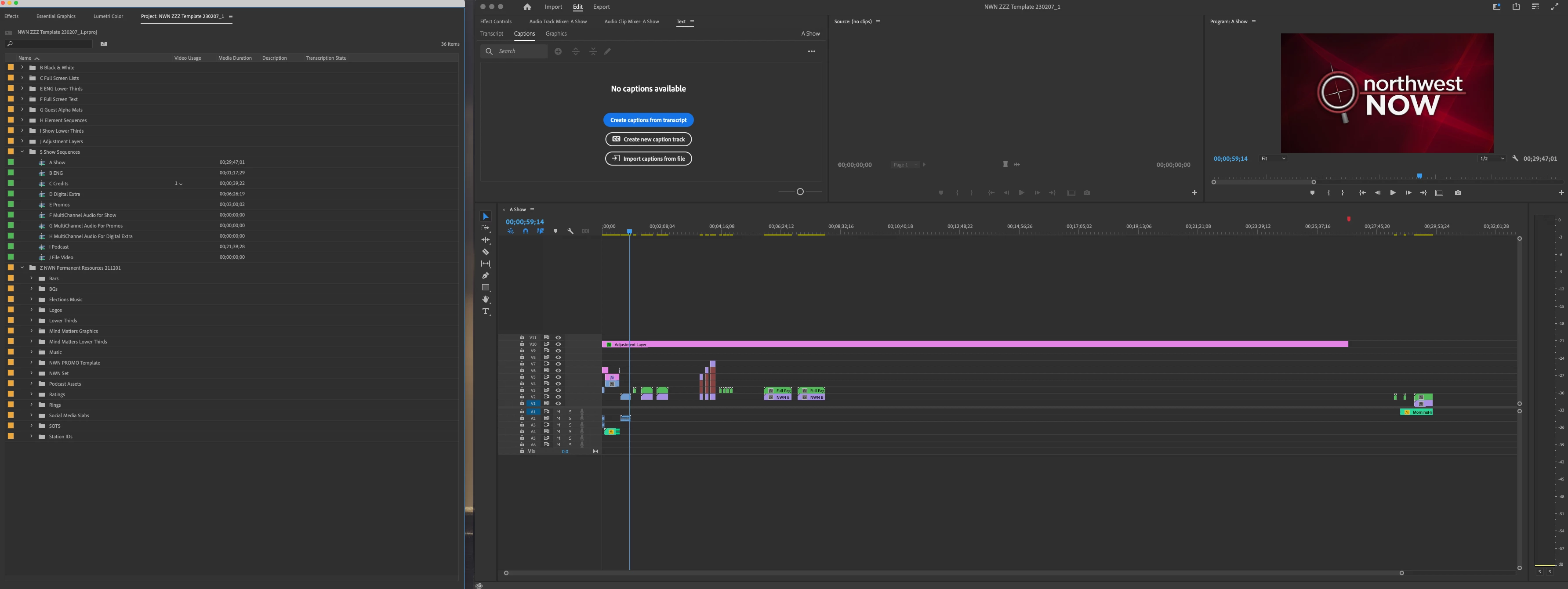 I consider templating part of my secret sauce. It is vital for consitency in terms of how a show looks, and it makes cutting new shows extremely easy. I template everthing - with the template having pre-imported all the base assets for every show, all the graphics, and a rough-out of the timeline. Once I have assets in the project folder, I do one sync with Watchtower - and they're all watch folders from then on as I build. I also have a template for a project folder - which is also copied each time. It includes empty ingest sheets, spots for various types of outputs, and a standard bin system. Each template is copied and renamed with the show number and the slug - and then once I'm working in the timeline, it's basically a game of knockout - where I can quickly define and delete elements I don't need - or make th something from the pre-imported assets. I also have templated sedquences  - broadcast for instance requires me to output six channels of audio - so I make a subsequence of the show, or the promos or whatever - and drop them into the new six channel sequence etc. That sequence is where I do captions and final legalizing on audio etc. I've been using Premier this way for years - and I would have failed without developing this sytem. This gets pretty deep, but it's the way to go. I actually teach this. Below is the template's timeline without a show's project folder imported. Below that is my project folder system over on one of my aux drives.