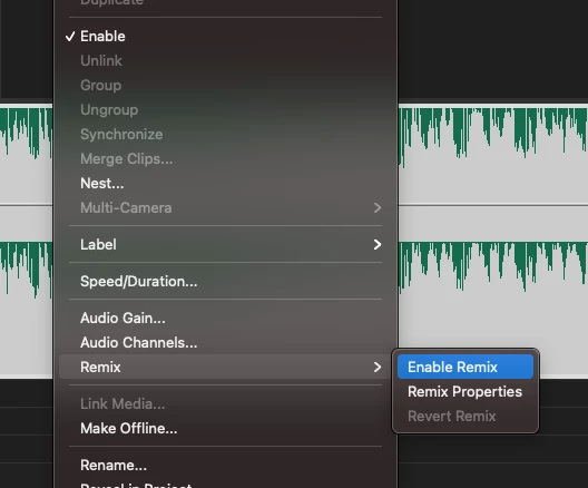 - In the Clip menu, or by right-clicking on a music clip in your timeline, select Remix > Enable Remix
