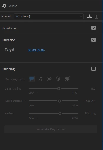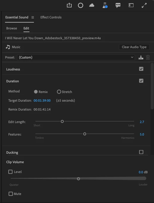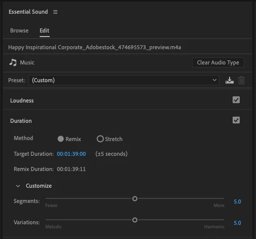 - or, in the Essential Sound Panel, with your clip selected in the timeline, tag the clip as Music audio type and select Duration > Remix