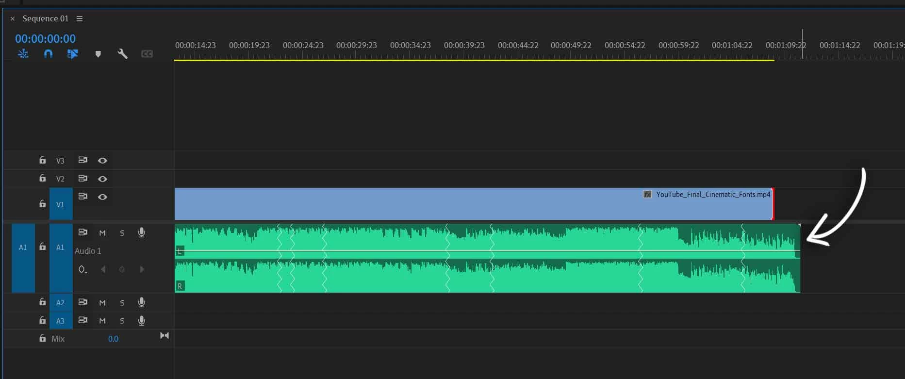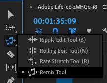 - or, click and hold in the Ripple Edit tool group in the Toolbar panel, select Remix Tool, then click and drag the right edge of your music clip in the timeline.