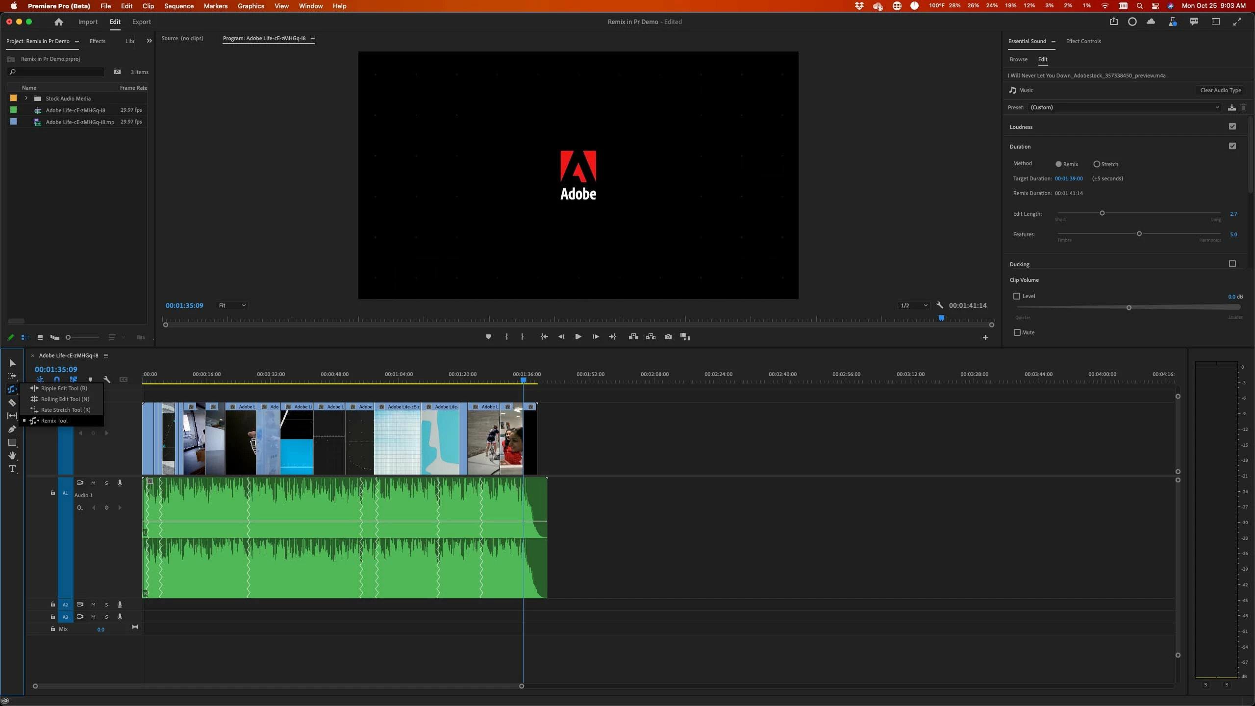 Remix is a feature powered by Adobe Sensei that quickly and smoothly re-arranges any musical composition to a new duration, saving hours of cutting, rippling, adding fades, previewing, then undoing and starting again, trying to cut a piece of music to fit the length of a scene. Whether your music clips come from a favorite stock audio service like Adobe Stock, your personal or commercial libraries, or even your neighbor's garage band, Remix will find the ideal cut points or loops, contracting or extending the length of your songs almost instantly.