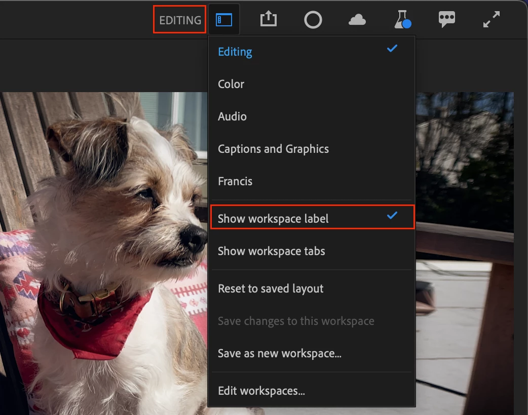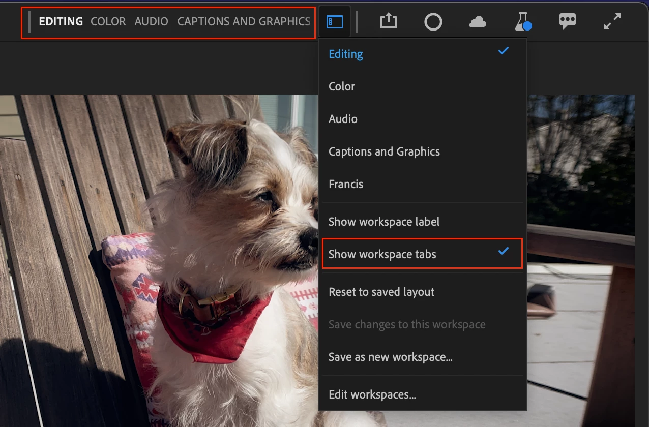 If you are like me, you probably only use 3 or 4 workspaces (mine are Editing, Audio, Color and Captions & Graphics and a custom workspace.) You can reduce the number of workspaces that show up in the list by choosing “Edit Workspaces” and dragging the ones you don’t use to below the “Do Not Show” line.  You can also drag the workspaces into the order you want, maybe based on the way you typically make your way through a workflow.