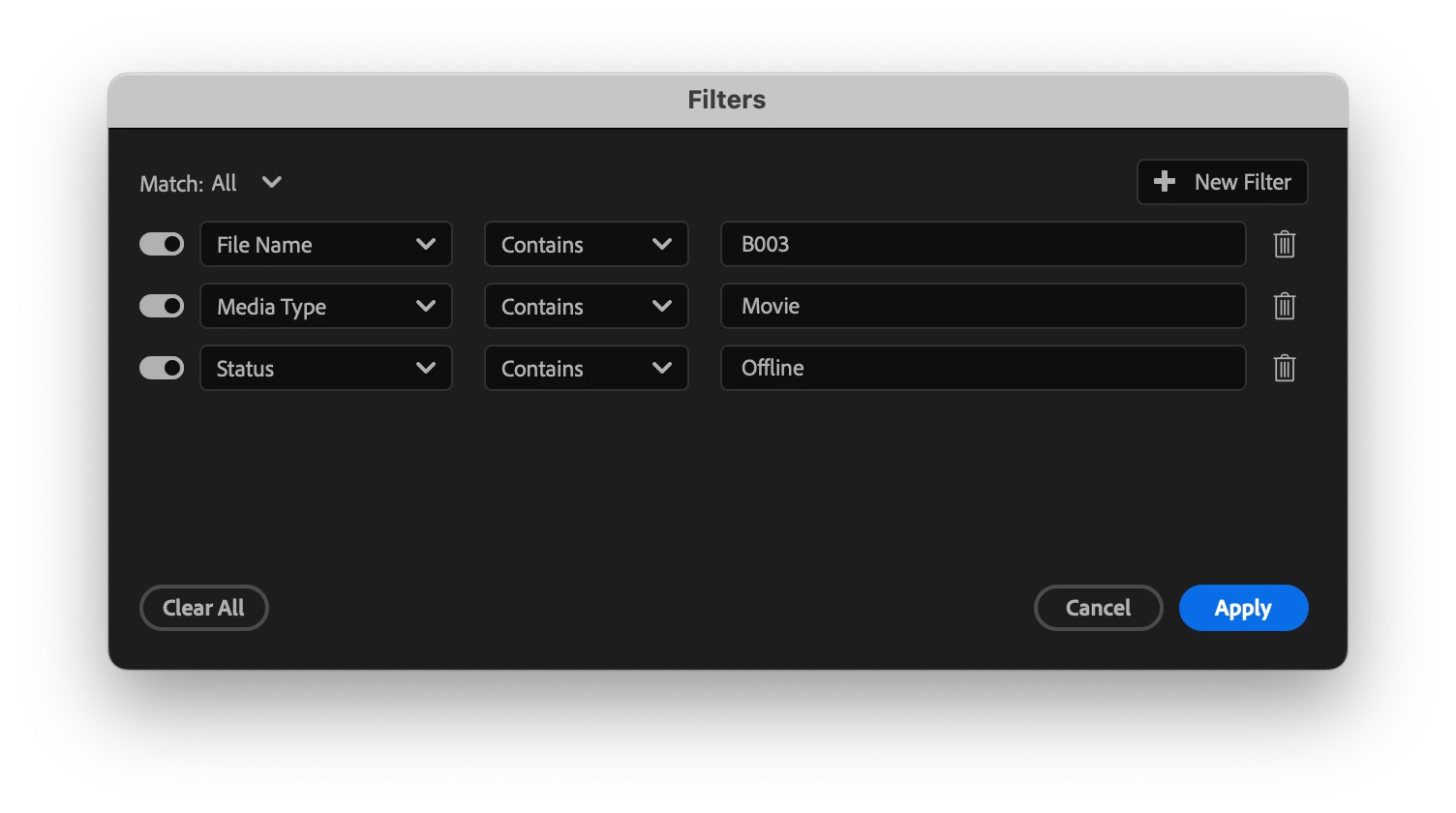 Advanced filtering allows you to refine your search results with precision by applying filters based on metadata. Whether you’re working with hundreds of clips or trying to track down that one perfect shot, Advanced Filtering helps you zero in faster.