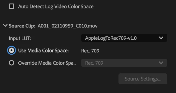 Lumetri Settings will show that the clip’s Media Color Space is set to “Apple Log/ Rec 2020” and the clip will have an automatic tone map applied using the “ByChannel (good for log video)” method.
