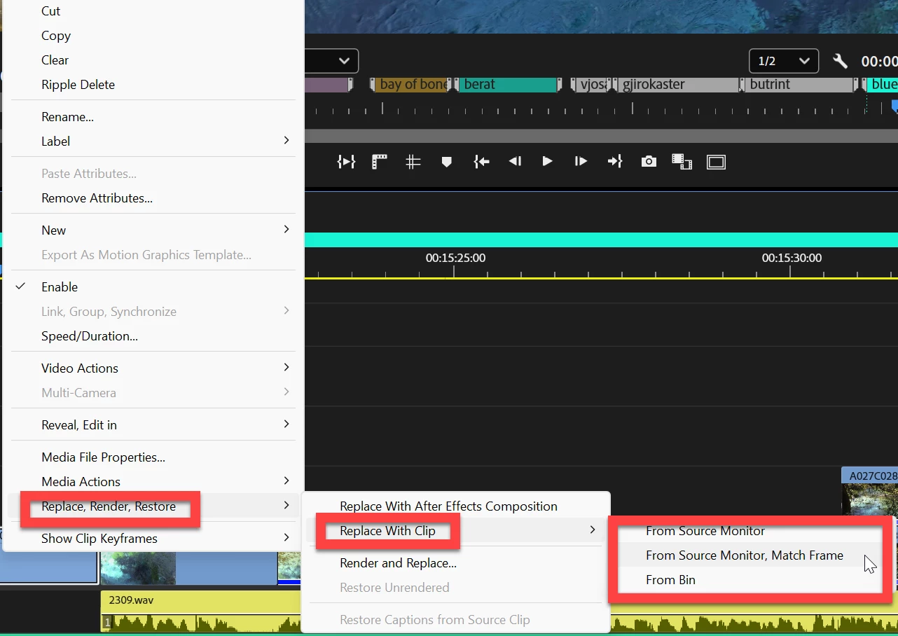 3. Be consistent when similar items appear in different menus. Whether in the Project or Timeline panel, common items like “Label” or “Media File Properties” appear in the same parts of menus.