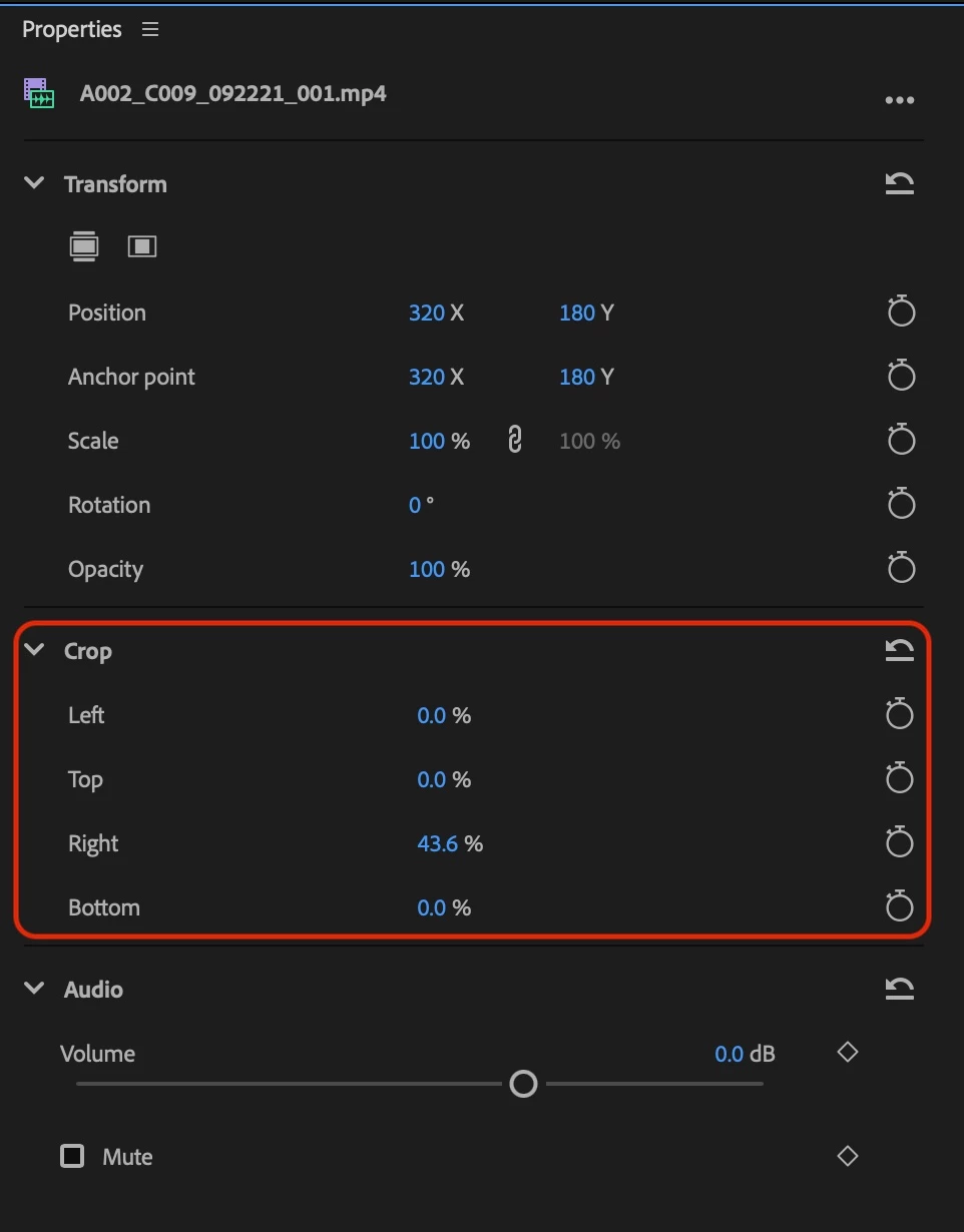 To use Crop in the Properties Panel, select video or image clips in the timeline. You can crop video clips using Left, Top, Right and Bottom controls in the Property panel. . You can reset any crop modifications by using the reset button on the top right of Crop or by using the Undo command.