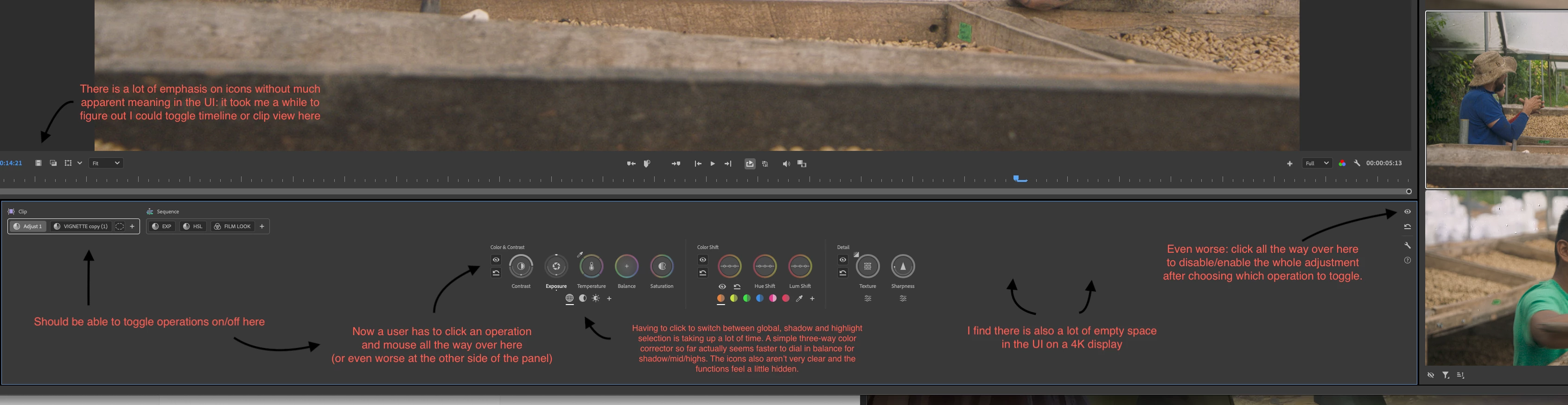 There are a lot of icons in the UI now that are unclear or seem a little hidden. The cycle global/shadow/high is one such example. Also it took me a while to figure out I could switch from timeline to clip playback right under the program monitor. The icons are small, unclear and feel hidden.
