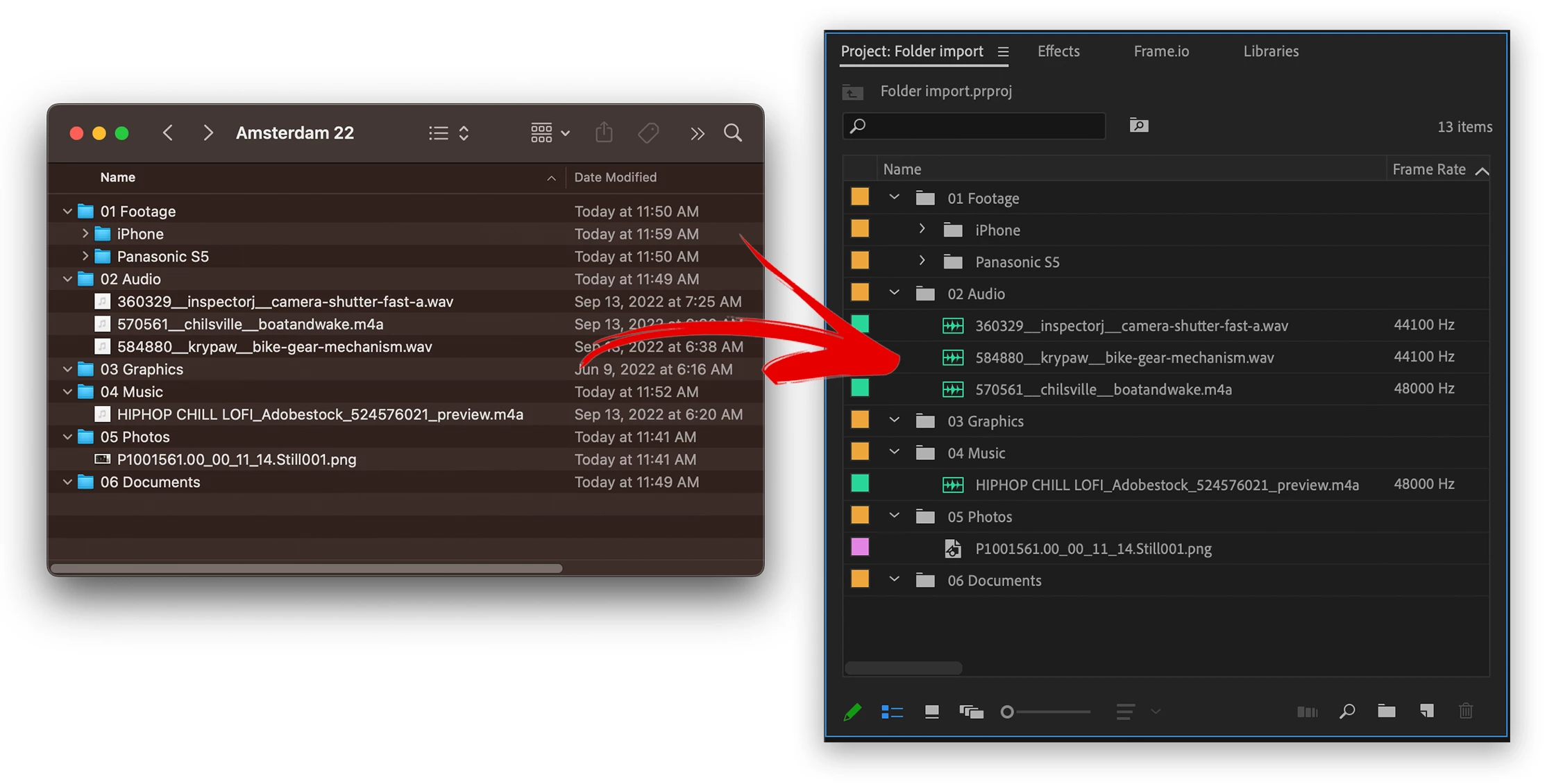 Premiere Pro will now replicate the folder structure exactly when importing folders. In previous versions of Premiere Pro, empty folders and folders containing only one file were not included as part of the import operation; the files would be imported, but not the folder itself. Now, in the latest beta build, 23.6.0 build 15 or later, all folders will now be included when importing assets using File>Import, Drag and Drop, and Media Browser.