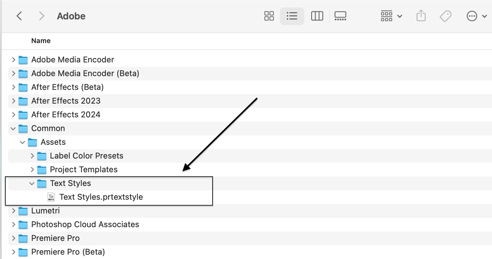 New local Text Styles folder at: Users/username/Documents/Adobe/Common/Assets/Text Styles
