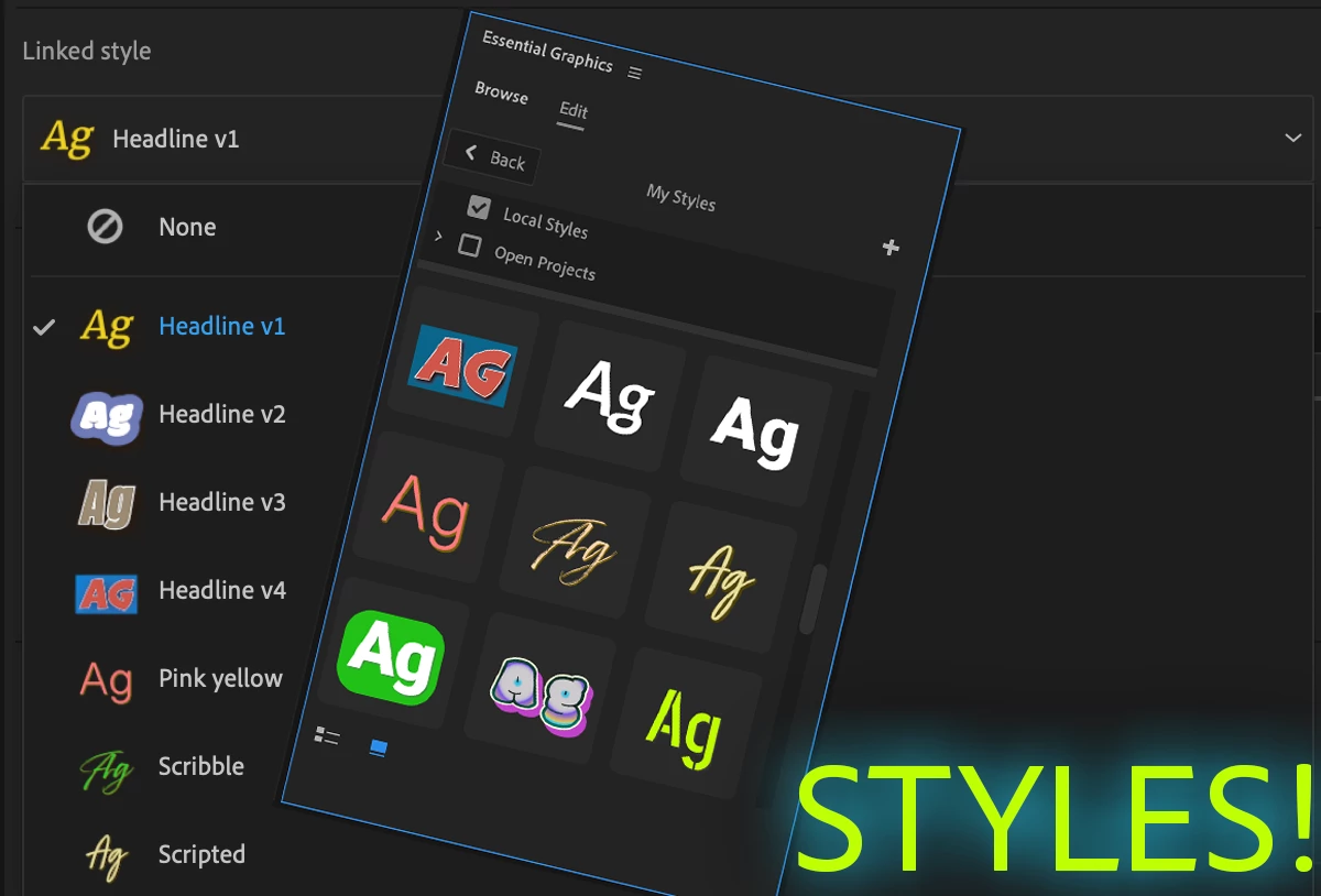 - Access the style browser by clicking on the grid icon in the styles section in the Essential Graphics Edit tab.