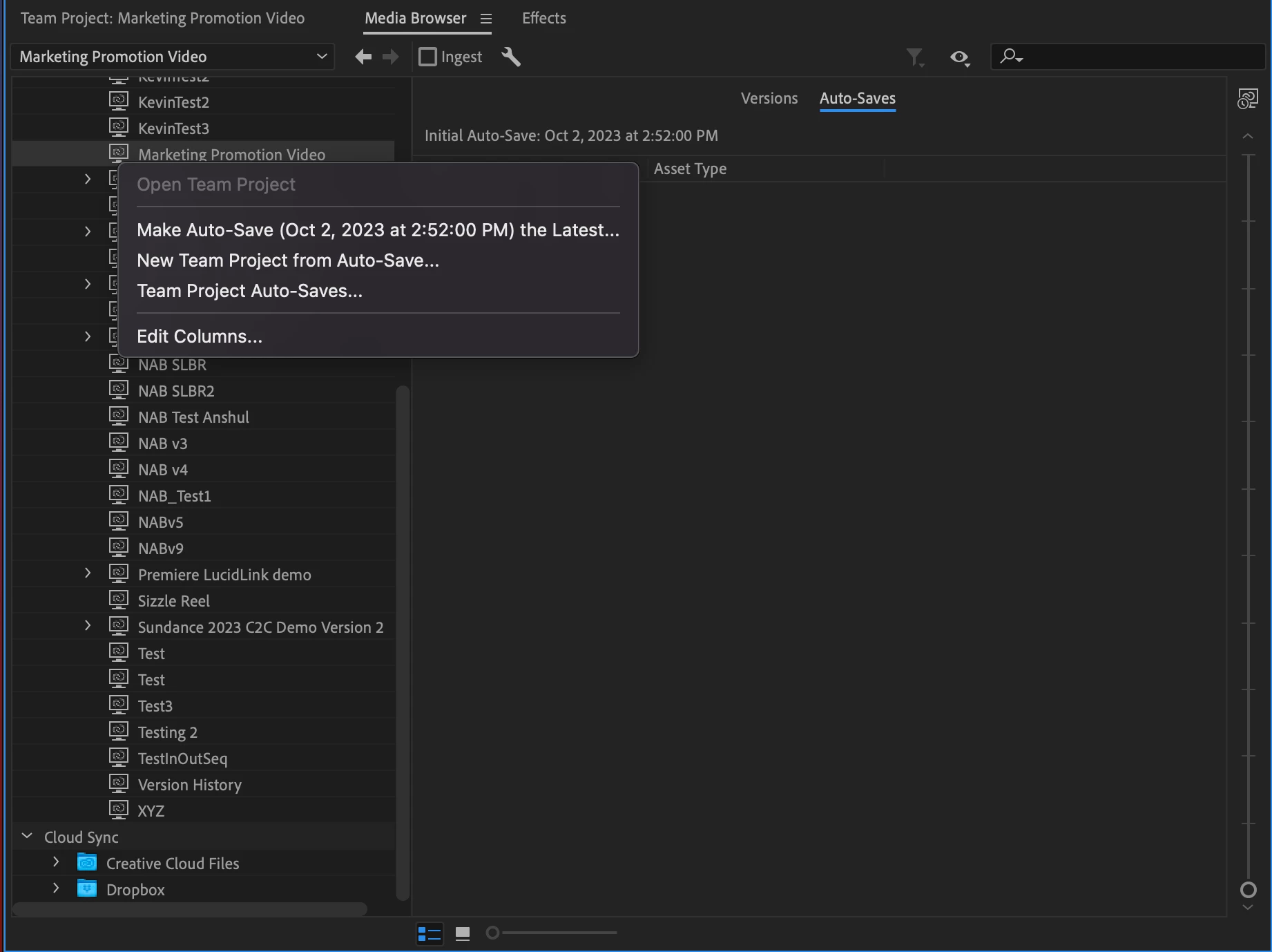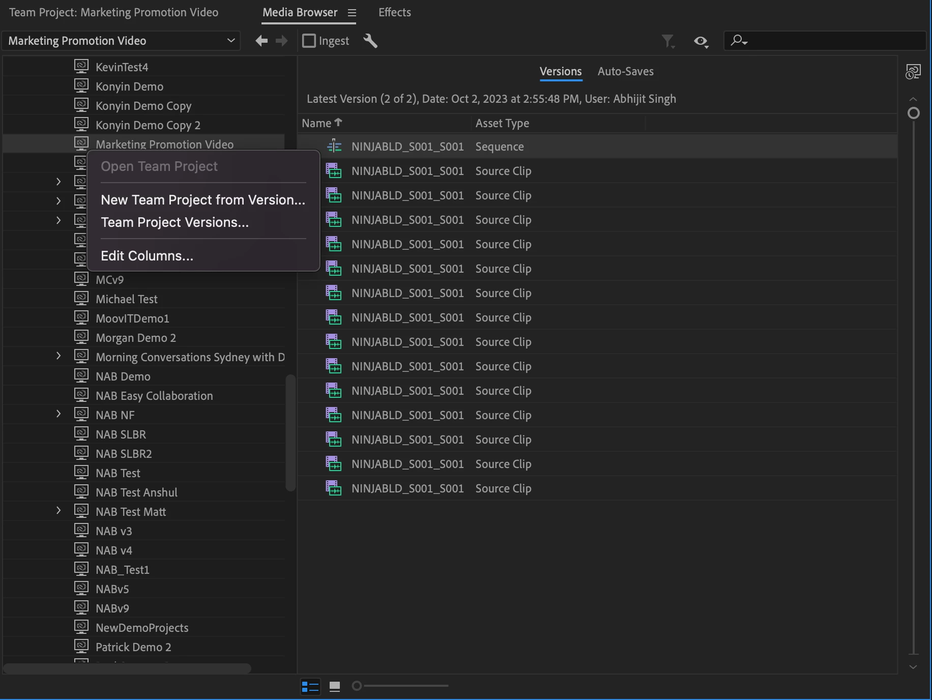 Selecting Version History or Auto Save History opens the Media Browser in Premiere Pro and selects your open Team Project.
