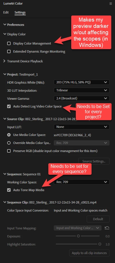 New mechanism makes more sense, understand the clip's colour space when you import it and allow exposure/saturation adjustments directly via the new Lumetri settings option.