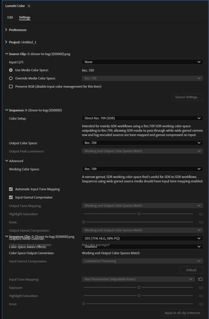 Then subsequently, closing Advanced section again and jumping from Direct Rec.709 to Wide Gamut Tone Mapped, then opening Advanced section again causes another smaller shift in the listing at the Sequence Clip section.