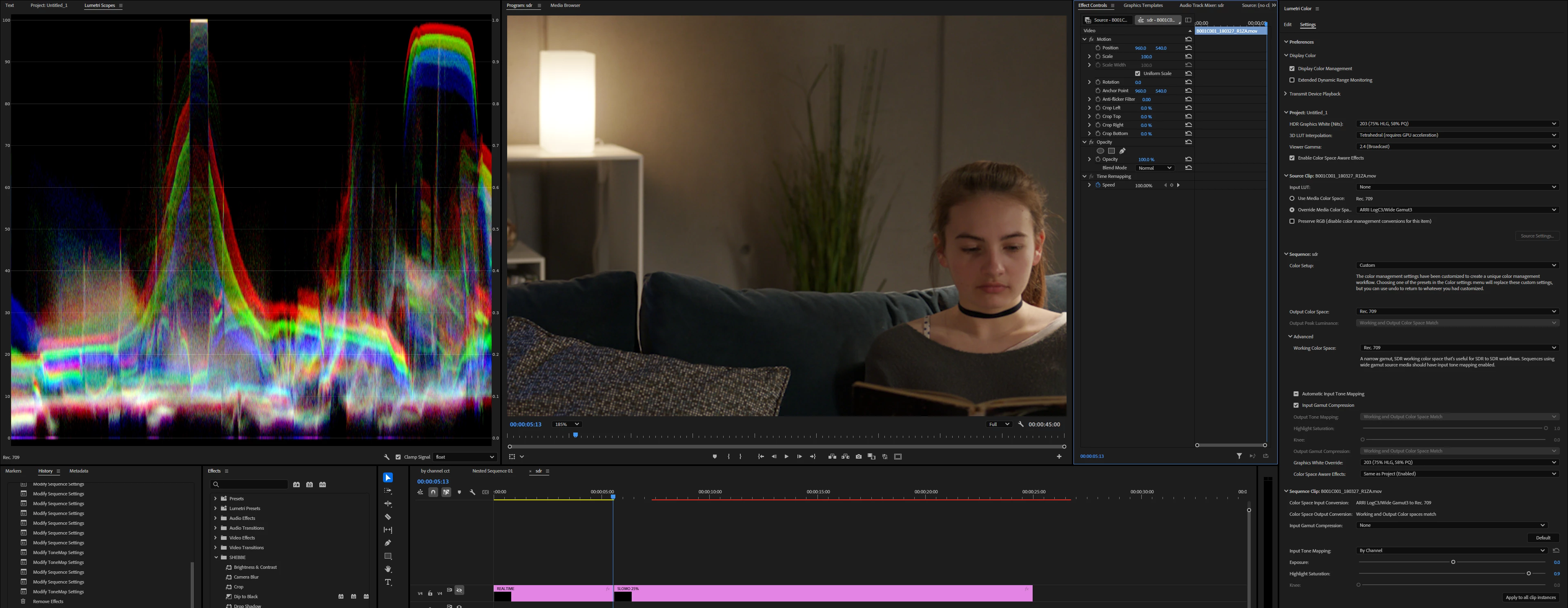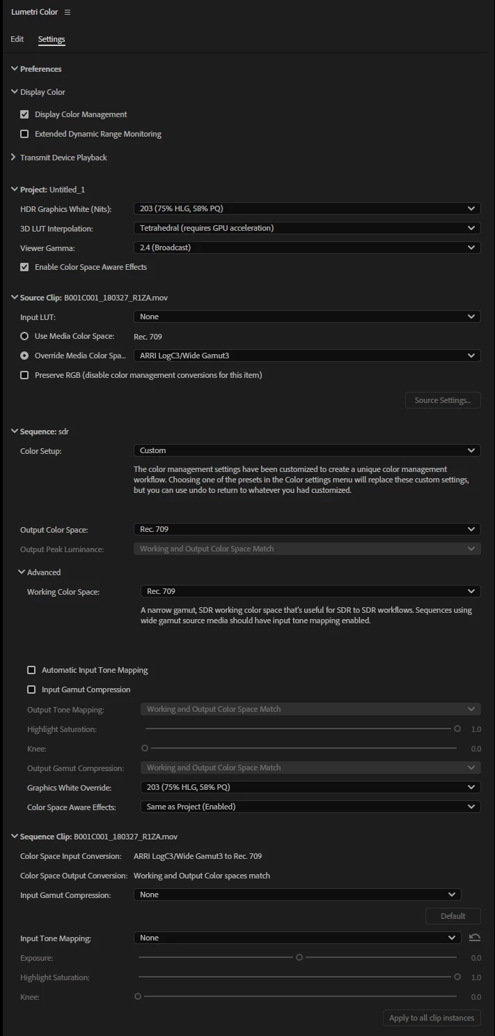 - Each sequence’s color management is easily configurable in the Sequence controls of the Settings tab of the Lumetri panel. By default, color management works similarly to the Premiere Pro color workflows you’re already used to when using the default Direct Rec.709 (SDR) preset. Alternately, you can choose to use one of our wide-gamut color processing presets to maximize the image quality of all grading and timeline effects when using wide-gamut or wide-latitude source media. Regardless of how you choose to work, Lumetri and other effects have been made color space aware, so they work well in any preset.