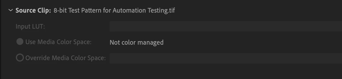 Currently for certain supported formats (TIFF, DNxHD, DNxHR, XDCAM HD, etc.), Premiere Pro displays these clips as ‘Not color managed’. For these clips, customers cannot override the color space of these clips . Also, the ability to add any input LUT via ‘Source Clip’ section is disabled.