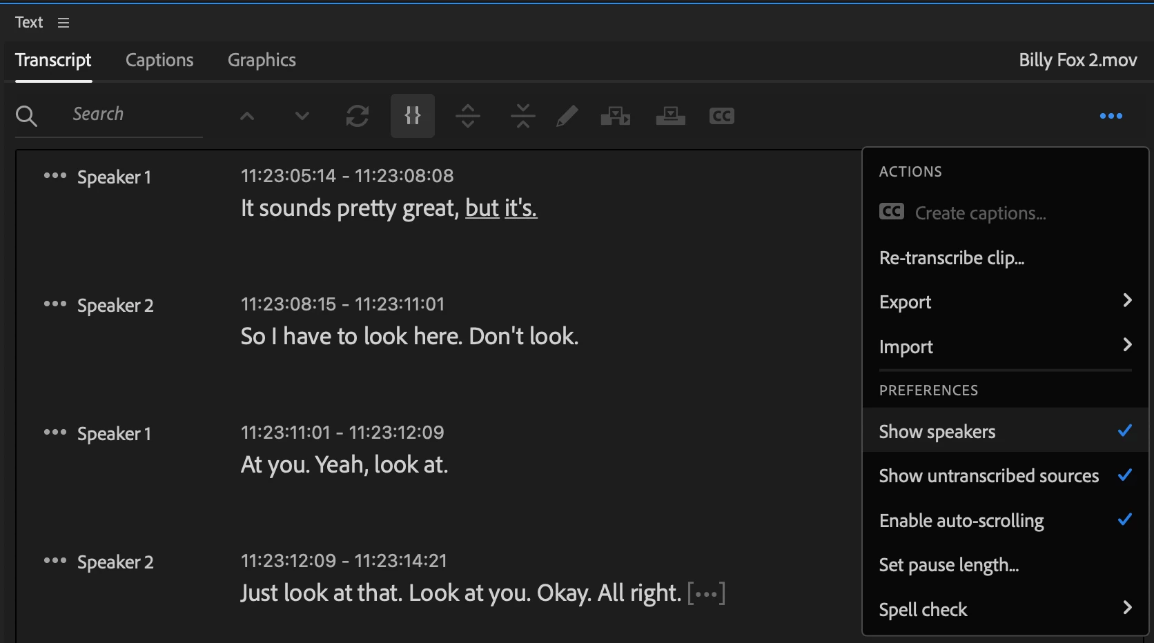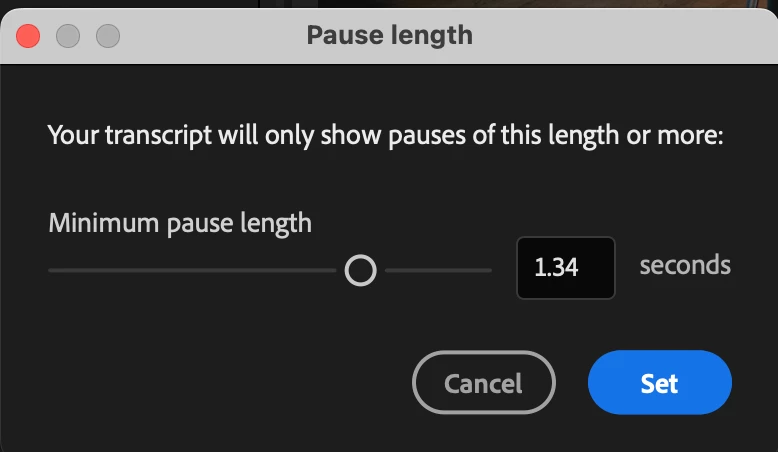 To change pause duration in the Transcript panel: