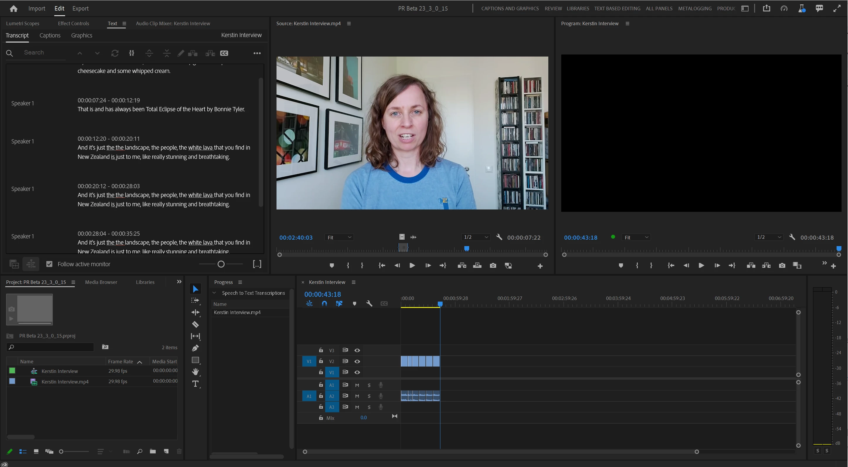 Loving this feature. I wish there was a way to batch edit the speakers from a sequence after auto transcribe is enabled. In other words, I have a cut, the source clips were batch encoded, now I'm in the sequence transcript and the speakers names aren't editable. I have to do a match frame to each source clip to edit the speaker name there. There should be some way to edit them in the sequence view and have it effect the source clips.