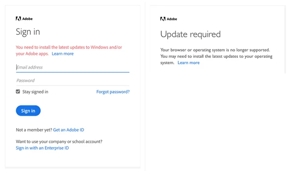 Adobe products require the latest operating system and browser updates—both for your security and to ensure that Adobe products function as intended. If you are not using the latest operating system or browser, you may see a warning when you try to sign into Adobe software.