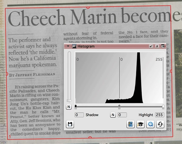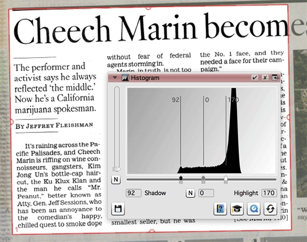 The good news is that if you are scanning a number of pages, the controls of the histogram are sticky. That means that once you set everything for the first page, all subsequent pages from the same souce should be good to go.