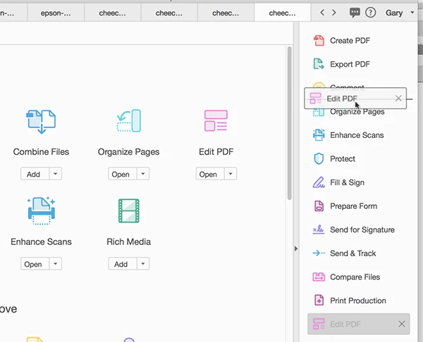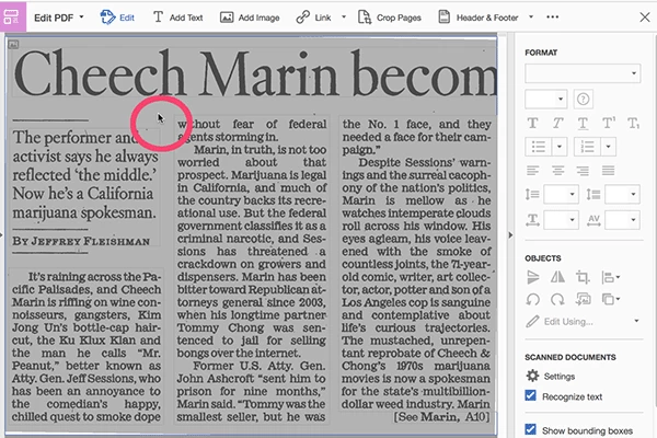 First open that original, non pre-cleaned scan in Acrobat, but this time after opening the document, click on "Edit PDF" in the Tools in the Right Hand Panel. If you do not see "Edit PDF..." in the Right Hand Panel, open Tools and click on the drop down below "Edit PDF" to add it to the Shortcuts on the Right Hand Panel. "Edit PDF" is such a valuable tool that if you do not already have it there, it should be for easy and quick access in the future.
