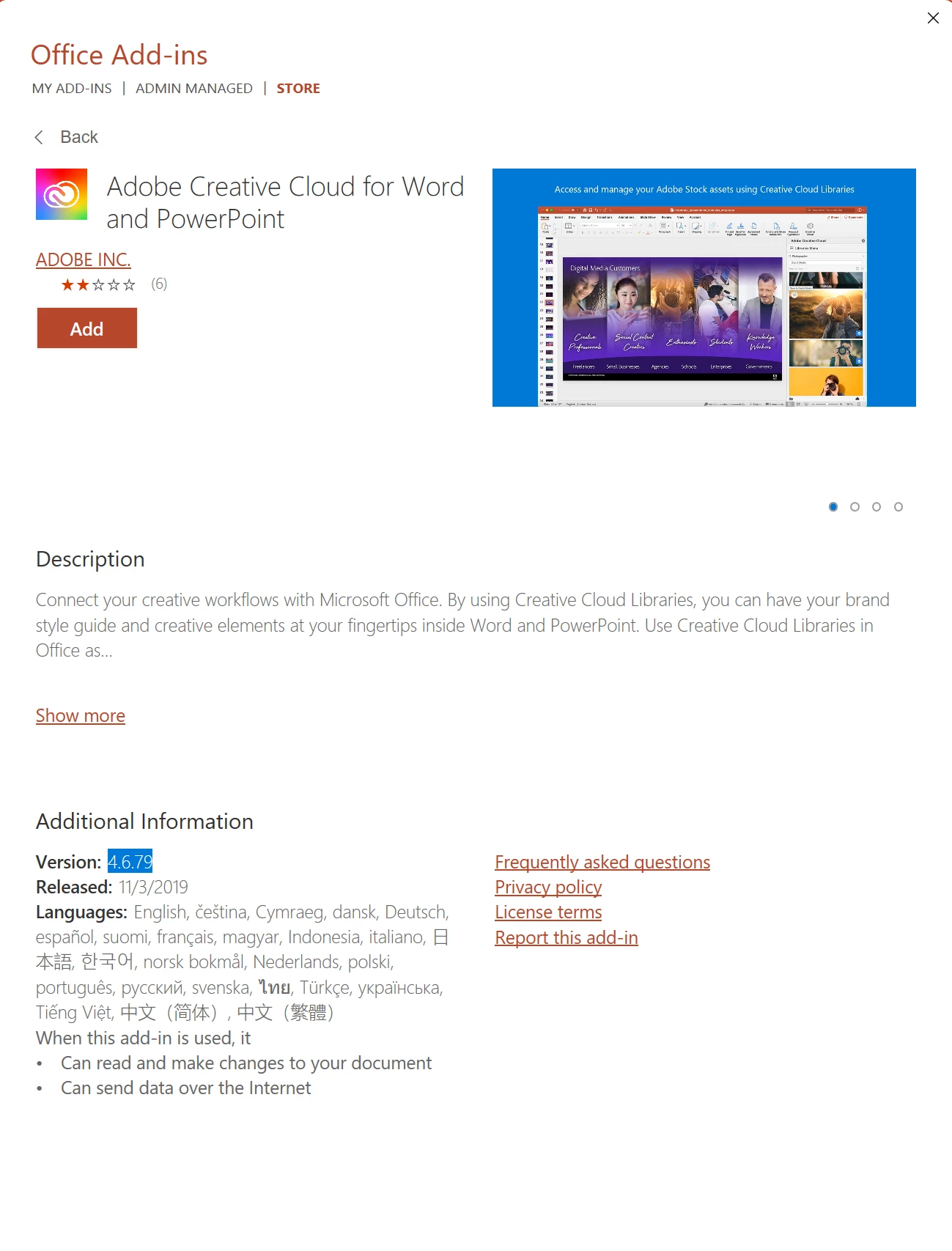 Since around March this plugin no longer seems to be compatible/work with Word/PP. Despite several workaround attempts the library itmes just do not import. There have been countless forums with Adobe but it seems they have yet to provide a solution. Come on Adobe sort this out please it's crippling to our workflow.