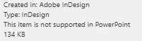The creative cloud add-in for powerpoint used to work flawlessly when transferring items from Indesign into "your library" and placing into a powerpoint. Recently, everything created in Indesign is grayed out and says "this item is not supported in powerpoint" when hovering over the item. I have the current version of the plugin installed (4.6.79) and Adobe Indesign 2025.