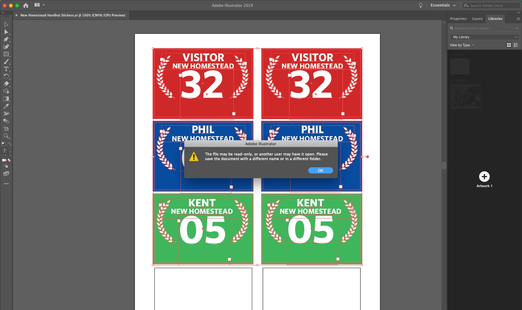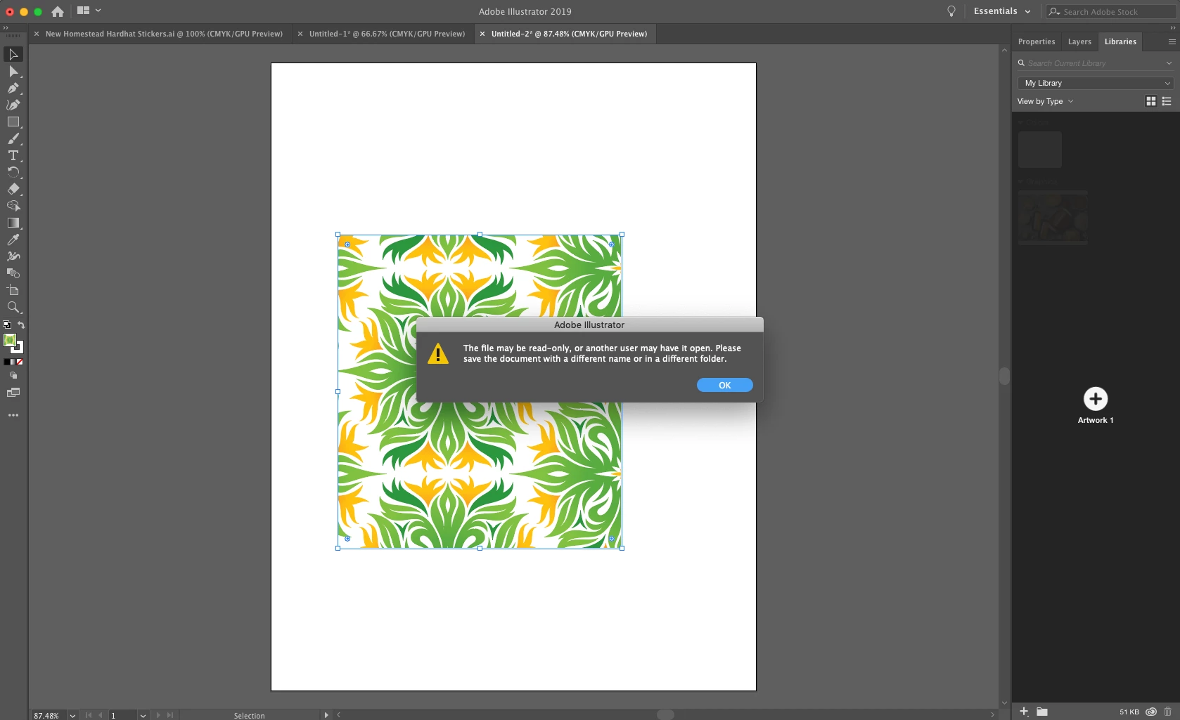 So far I've logged out and back in to my Adobe CC App, tried creating a new library to add things to (didn't work still), tried adding things in Illustrator and I get the error that I don't have permission/file might be read only and to resave (attached photo). Resaved and tried a brand new document with just a filled square on it to drag in or add with the plus and got the same error message (attached photo). Photoshop would only add color swatches.