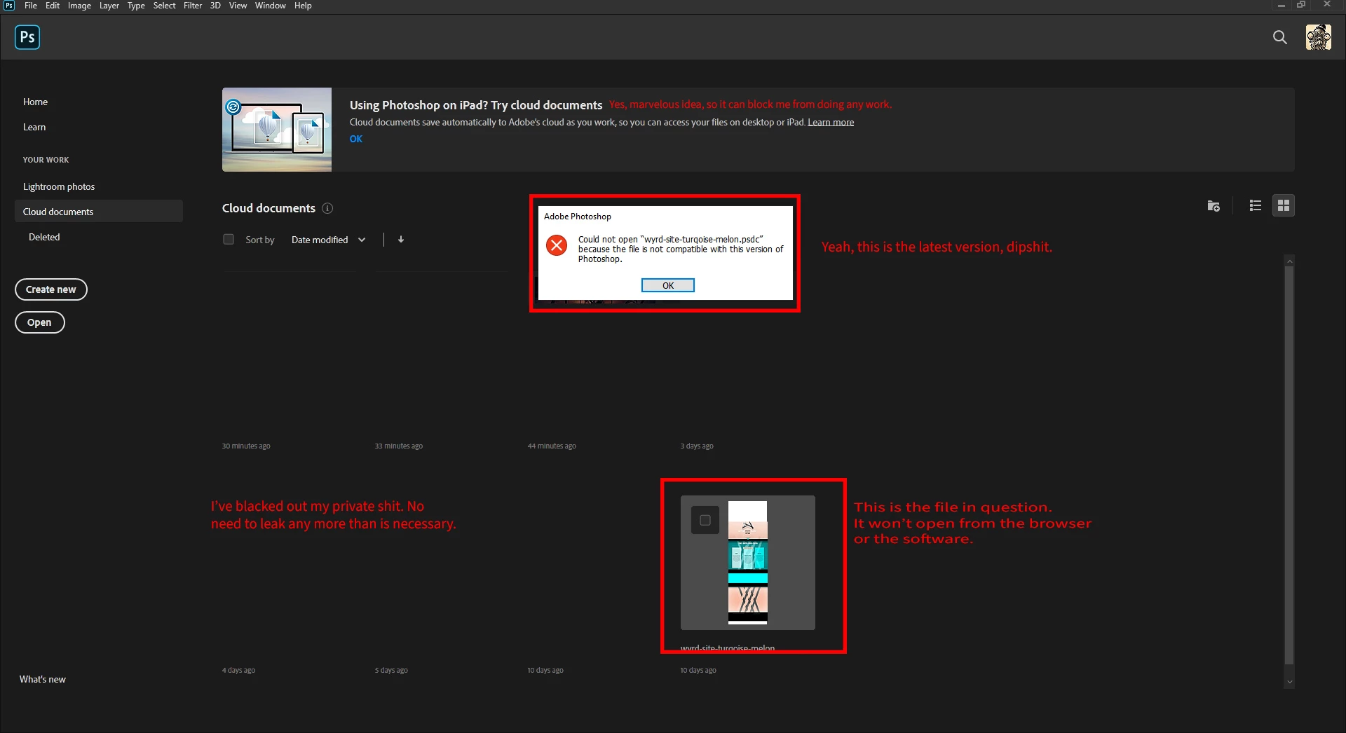 It's a great feature in theory. Unfortunately, it's giving me a lot of guff when I want to work on my file again. In this case, it's the design for my small business launch. I mean, sure, I can redo it. I have a desktop version that's about an hour behind the Cloud documents version in terms of work but man, incredibly irritating. I don't like having to wrestle my files away from friggin robots.