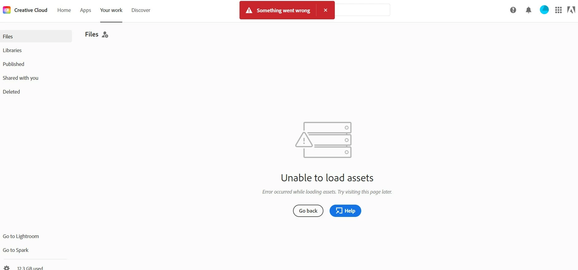 When I log into Adobe CC assets, it gives me an error that something went wrong and none of my previously loaded files of assets show up (see attached screenshot). I was able to create a new folder, but there is no option to upload files to it. I have been unable to view my image files or upload to any files for the past few days. I use this sharing feature for my photography customers and I don't know how to get around the error.