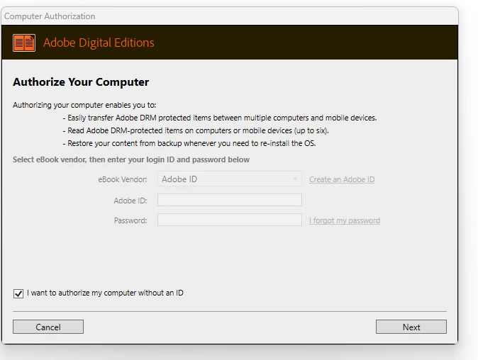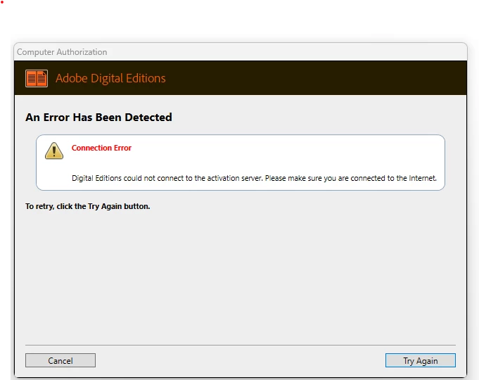 I am having issues authorizing my computer for Adobe Digital Editions. I have tried the desktop version and iPad version of ADE and both keep giving me the error message of, "Connection Error, Digital Editions could not connect to the activation server. Please make sure you are connected to the internet." I have tried selecting the option, " I want to authorize my computer without an ID" and still nothing. I was told by Adobe support, "checked for Digital Editions but it seems the app is not shown as an option so you may please select the Creative Cloud option and submit your feedback. User Voice-