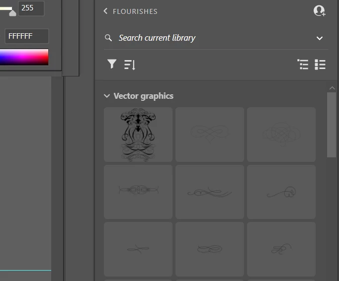I have a set of flourishes which are black on transparent. In the Library panel, they are almost impossible to view because the default background is dark grey. I don't want to change the whole UI of Illustrator just to see library items. Please provide a more sensible default background color for handling transparency. Ideally, a toggle between white and black would be most useful.