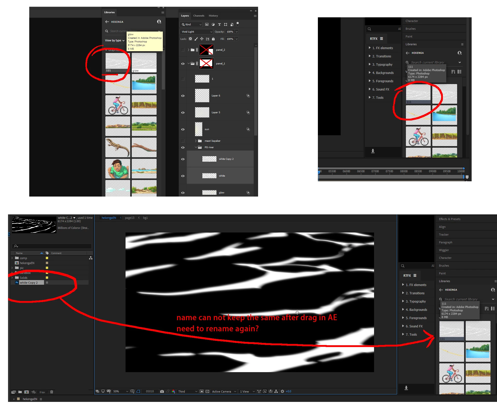 after rename the file in library in photoshop, then drag the file in AE. you will find the name of the file become back to the original name in AE project panel. and need to rename in AE again.