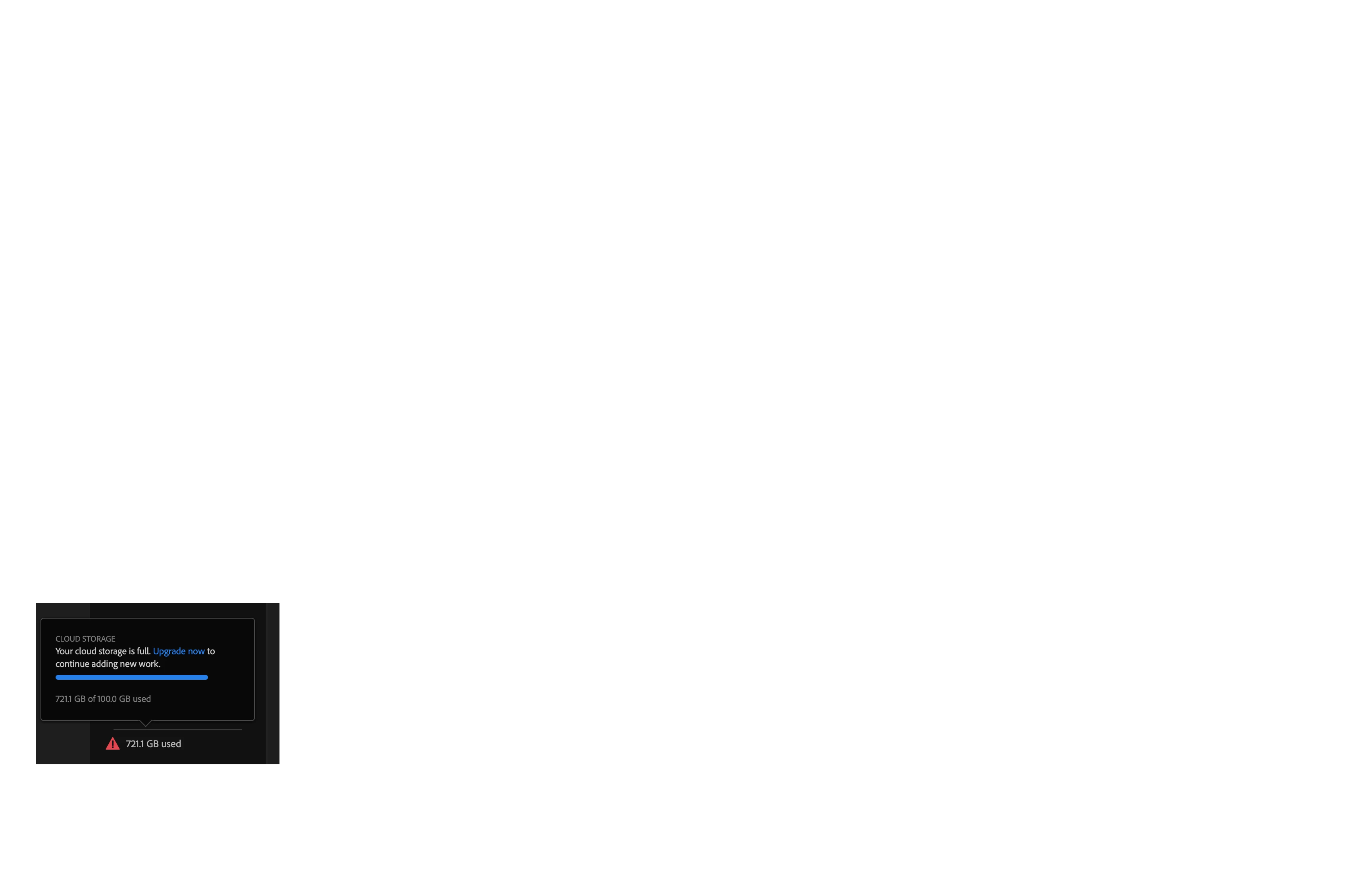 eparkproParticipantForum|Forum|1 year agoMarch 28, 2024Upgraded plan, now cloud is out of spaceForum|Forum|1 year agoMarch 28, 20240 replies104 viewsI recently upgraded my plan and now it says I have 721GB used and I'm out of space. How is this possible after I've deleted 12,000+ images from Lightroom?CC LibrariesDesktop SyncOtherSharing