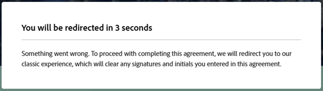 “Something went wrong. To proceed with completing this agreement, we will redirect you to our classic experience, which will clear any signatures and initials you entered in this agreement.”