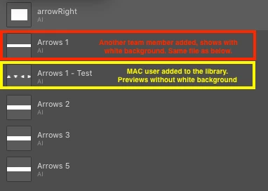 The vector graphics preview with a white background. If they add a new vector, it previews without a white background but just for that MAC uploader. If a MAC user, exports and uploads a library, all the vector art has white backgrounds (including their newer uploads). If a MAC user starts a new library, the graphic still appears with a white background for other MAC users.