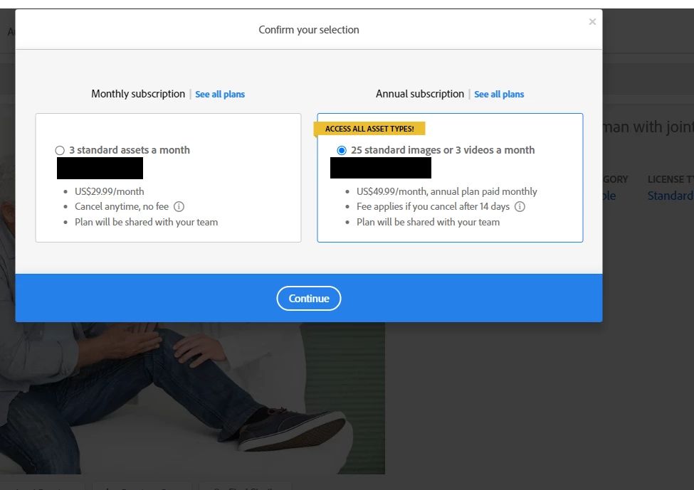 We have an Adobe Stock subscription and despite a valid credit card and paid bills, we can't buy images at the usual rate without a pop-up prompting us to pay for a new subscription... Makes no sense and now we can't get stock because we aren't going to pay an additional fee for something we already have.