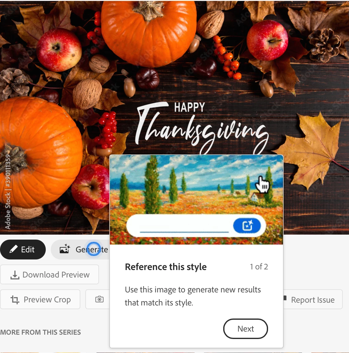 This pop-up appears with every Adobe Stock image I select. It blocks part of the image so I can't see it and there appears to be no way to close it. I've listed this as a Bug because it can't be turned off — either permanently (preferred) or per image.