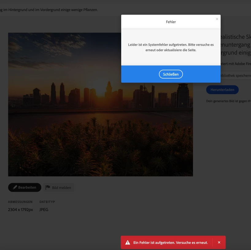 When I create an image online with "generate" in Adobe Stock and want to download it, I always get an error message in a blue/white box saying something like: