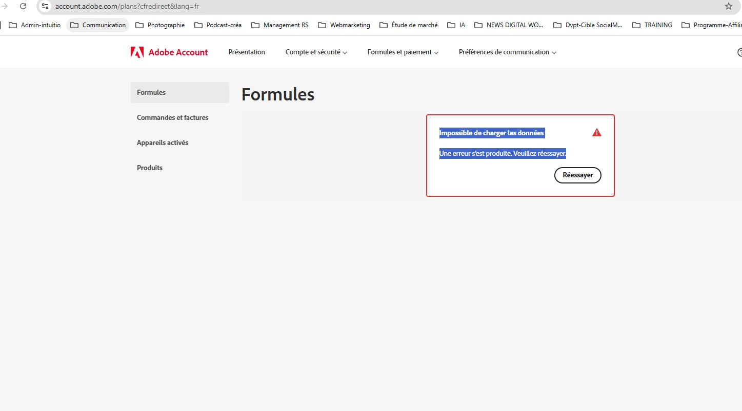 Je souhaite depuis 7 jours annuler mon abonnement adobe Stock qui est actuellement en période d'essai jusqu'au 18.12. Or il m'est impossible de puis 7 jours d'accéder à la page me permettant de le faire , une fenêtre apparaît quand je vais ici ,https://account.adobe.com/plans?cfredirect&lang=fr m'indiquant :
