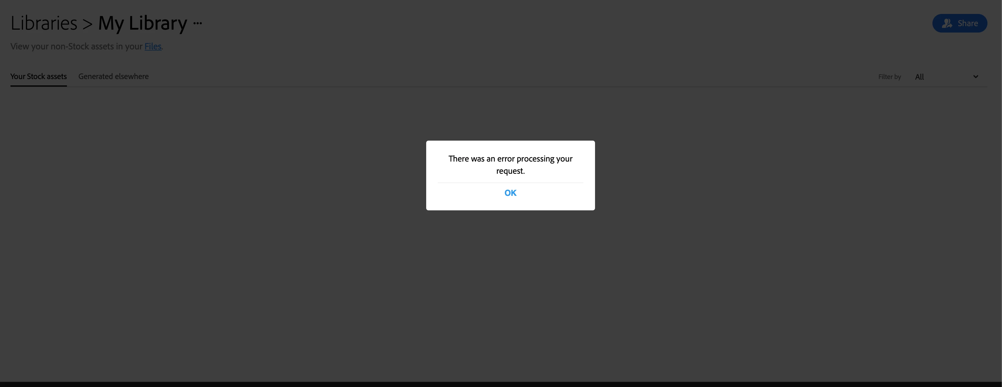 Whenever I search for anything when logged into my adobe stock account it comes up with a page not found error message whereas when I search when logged out, I can see all images. When I try to go to my library to see images I have already liked, i get another error message saying my request could not be processed. Any idea what is going on?