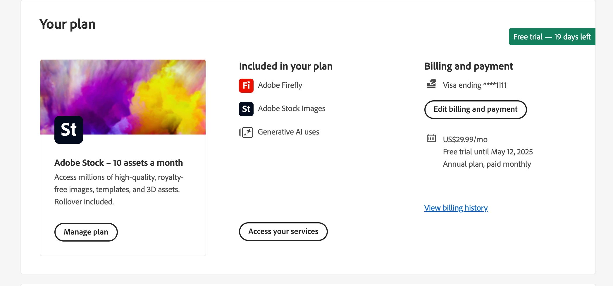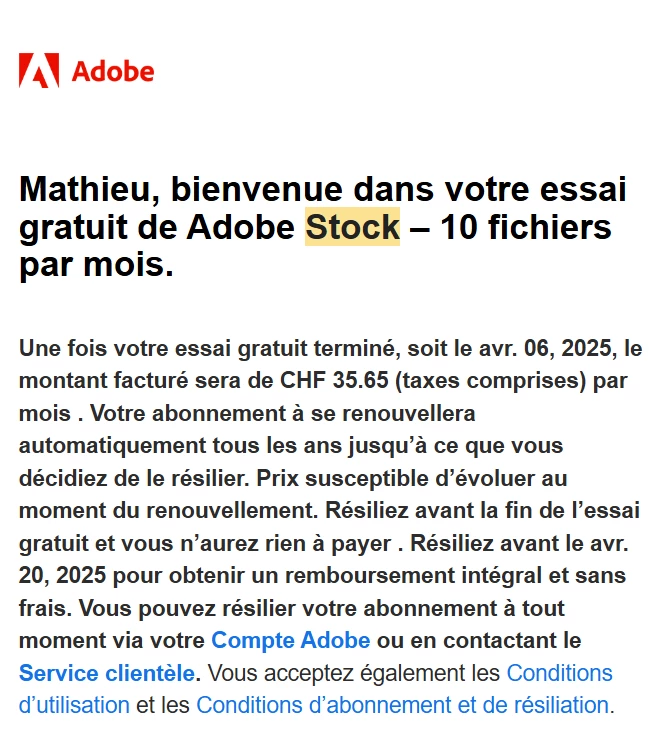 Adobe Stock s'était ajouté comme pub à ma commande lorsque j'ai téléchargé Adobe Illustrator. Une fois l'erreur réalisée, j'ai checké mes mails pour voir la date de limite de résiliation pour que ce soit pas facturé ou remboursé. Dans le mail il y a écrit :