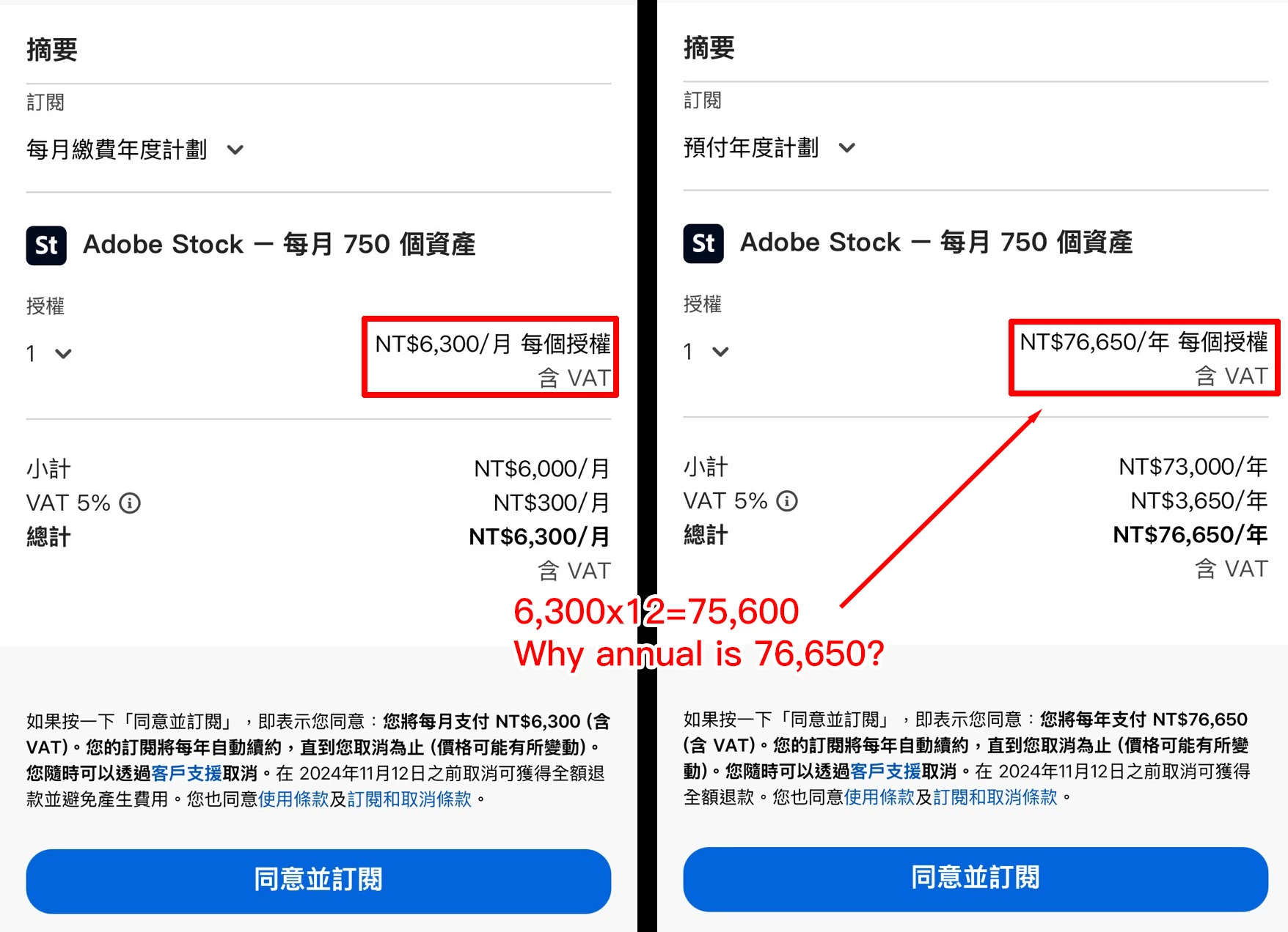I am going to subscribe the annual plan of Adobe Stock for our marketing team, but I find a tricky issue: the monthly plan is NT6,300 per month with VAT, so it should be 63,00x12=75,600 annually. But it shows 76,650 if I subscribe annually. (or it only happen in my country?)