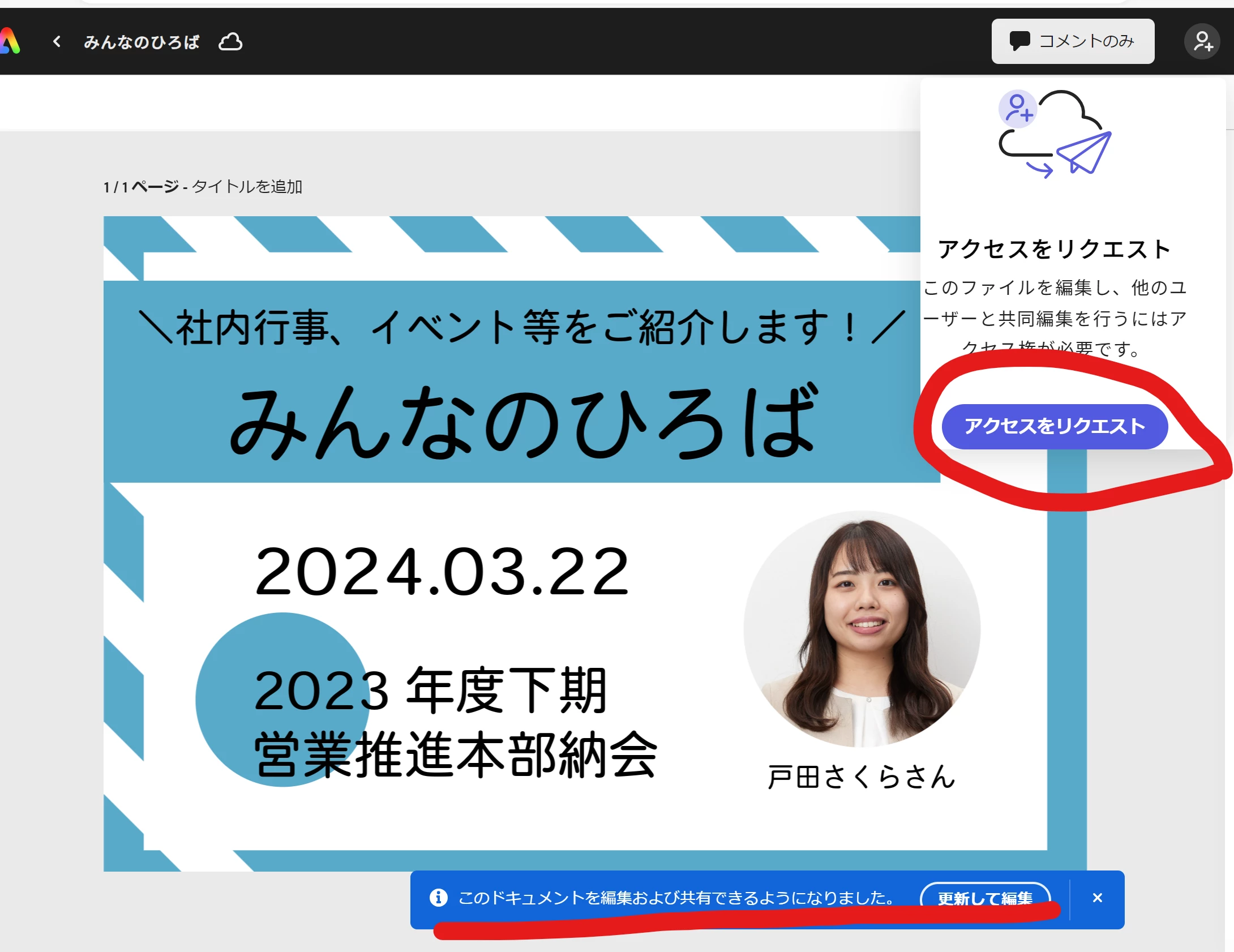 Ddefault36790675lnoqrtParticipantForum|Forum|1 year agoApril 17, 2024アクセス権を付与されたが編集ができないForum|Forum|1 year agoApril 17, 20241 reply216 viewsメンバーから共有されたプロジェクトを編集しようと思ったが、アクセス権なしということで編集ができない。画面上部ではアクセス権の付与を推奨し、画面の下部では編集ができるようになったと書いてあってよくわからない。Desktop Webデスクトップ web