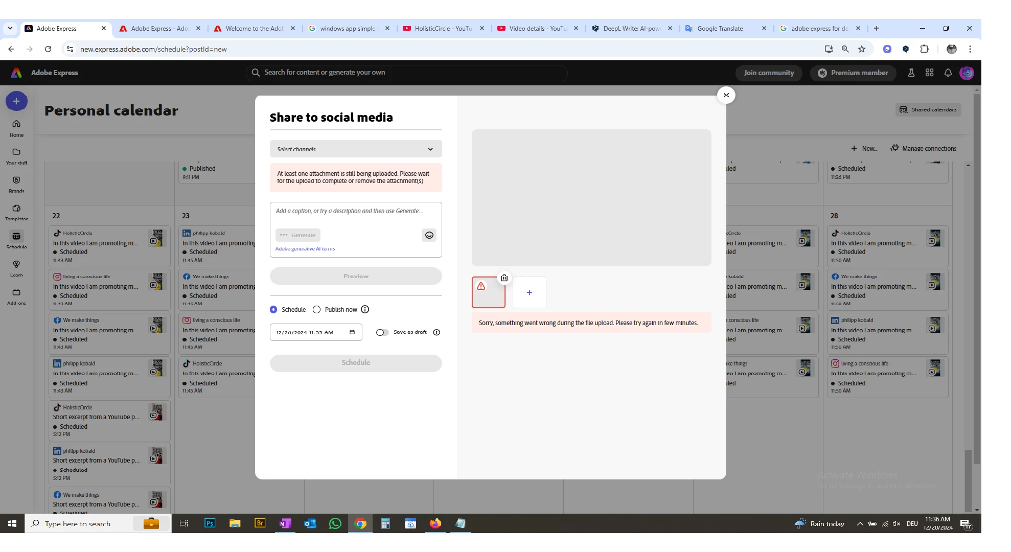 Hi, at first I thought it was a temporary scheduling glitch, but it is conatantly not working properly ... multiple issues ... and now on top of everything not working, I keep getting the same error massage on different files for a week now: "Sorry, something went wrong with your file upload. Please try again in a few minutes. " and I really do not have that kind of time ... first of all the error message does not go away and secondly it happens every second time I try to schedule a post. Also, for about a week now, when I schedule, the browser crashes and just needs to be refreshed with express. Also this past week every post I schedule is getting an error message "post could not be published" but then it is ???? who can understand that ..... I am so frustrated with this service, I cannot even explain ..... PS I am a video podcaster so I have super fast internet and do video editing online all day long... no proplem whatsover except with this crazy express tool I need for my short. Finally, I want to reach out to Adope, you can imagine the response ...................................