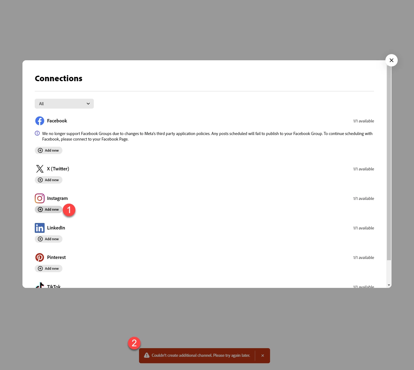 clicking on "new" for any social media channel yields the error "Couldn't create additional channel. Please try again later." There are no channels at all. This would be my first channel.