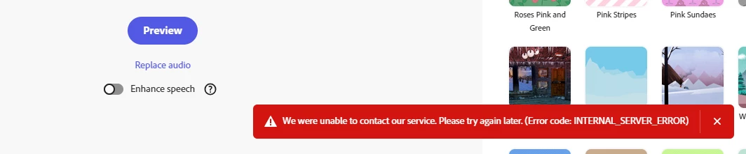 I have been trying to make short, animated videos from voice files using the "Animate Characters" feature but keep receiving the error message: "We were unable to contact our service. Please try again later. (Error code: INTERNAL_SERVER_ERROR)."