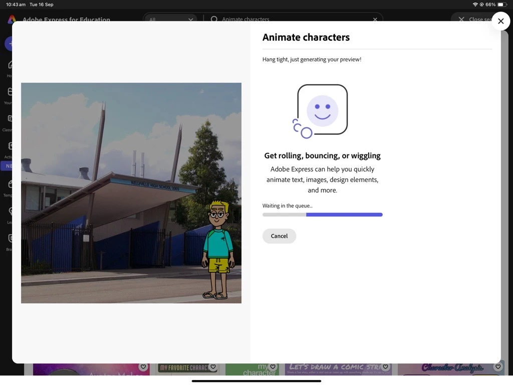 Hi @kylie_3503, can you confirm the device and browser you're using to work? Also, please confirm if other Adobe Express tools are working fine for you and if it's just the Animate Character that is having issues. If possible, please share a screenshot of the workflow for us to check.