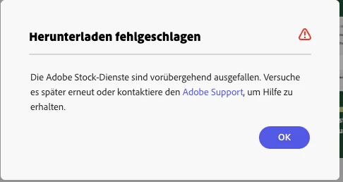 Vor 2 Stunden kam stattdessen die Meldung, das "Die Adobe Stock-Dienste sind vorübergehend ausgefallen. Versuche es später erneut oder kontaktiere den Adobe Support, um Hilfe zu erhalten."
