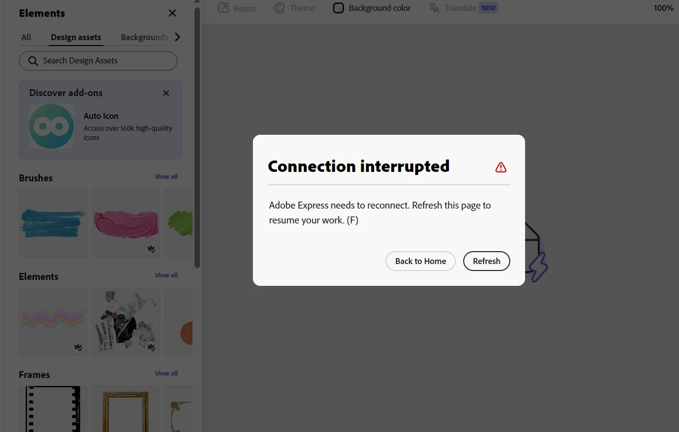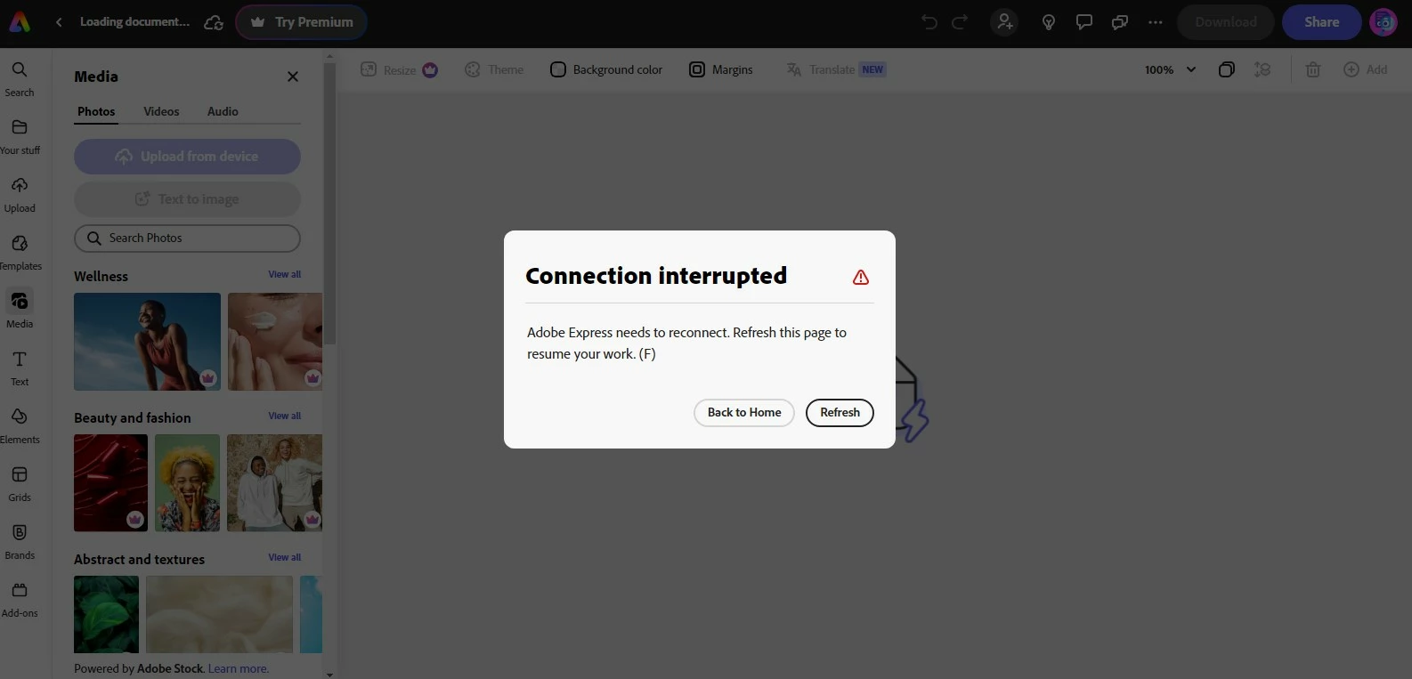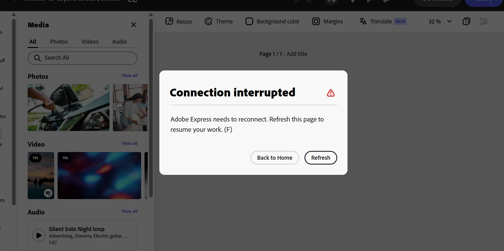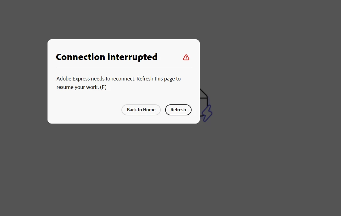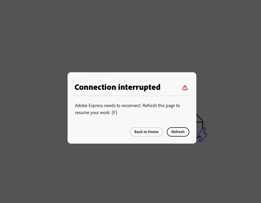 "Connection Interrupted. Adobe Express needs to reconnect." "Refresh this page to resume work."